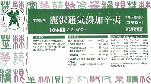 | 効能・効果 | 体力中等度のものの次の諸症: 嗅覚障害、嗅覚異常、鼻づまり、アレルギー性鼻炎、慢性鼻炎、蓄膿症(副鼻腔炎) |